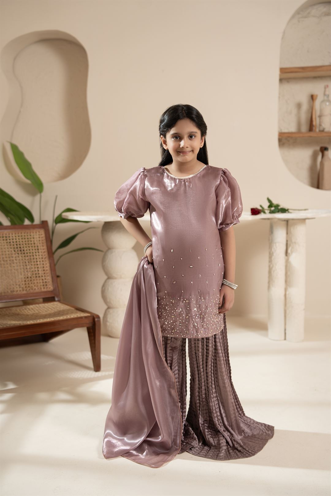 A graceful 3-piece outfit featuring a teapink shesha silk shirt adorned with sequin and stone work, paired with a crush silk sharara and a delicate dupatta – perfect for weddings and festive occasions.