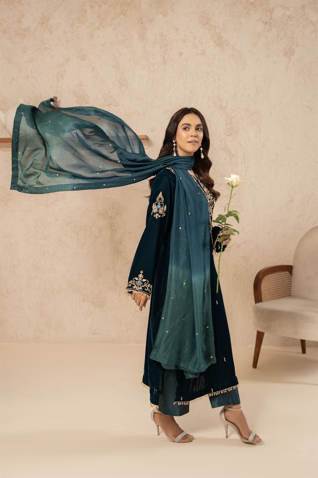 - Fabric: Velvet shirt, raw silk trousers, medium silk 2 tone dupatta