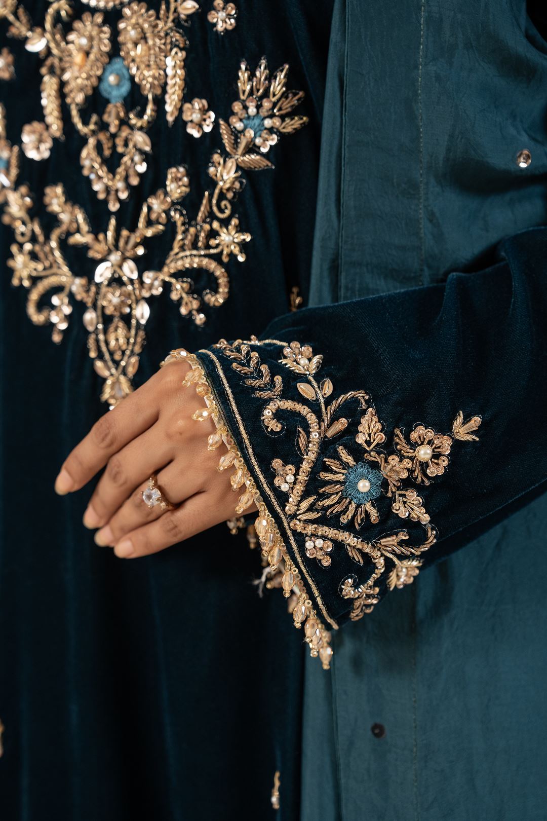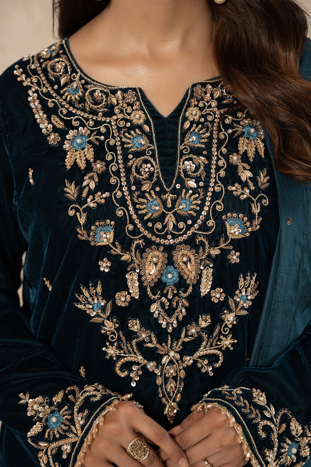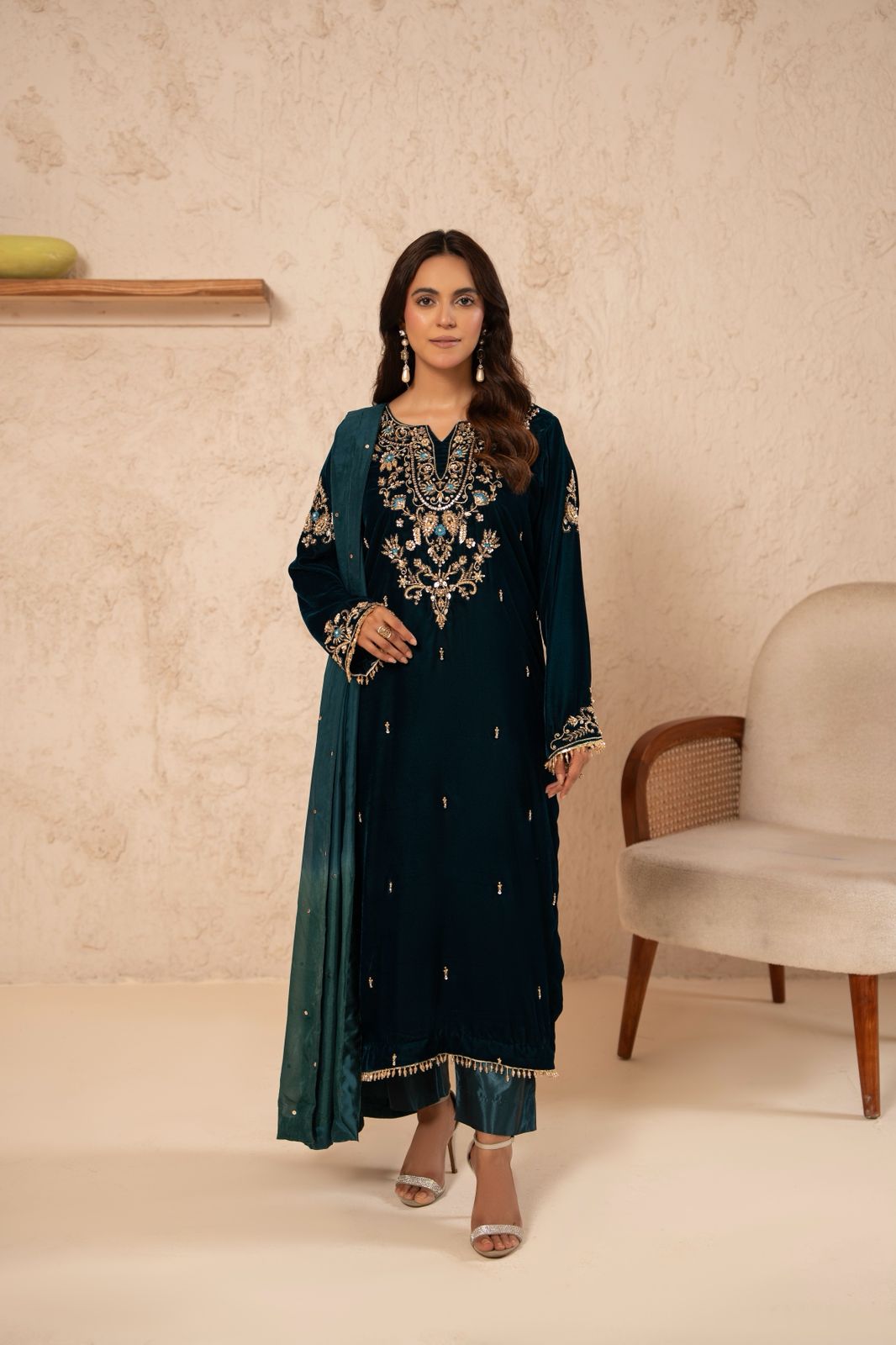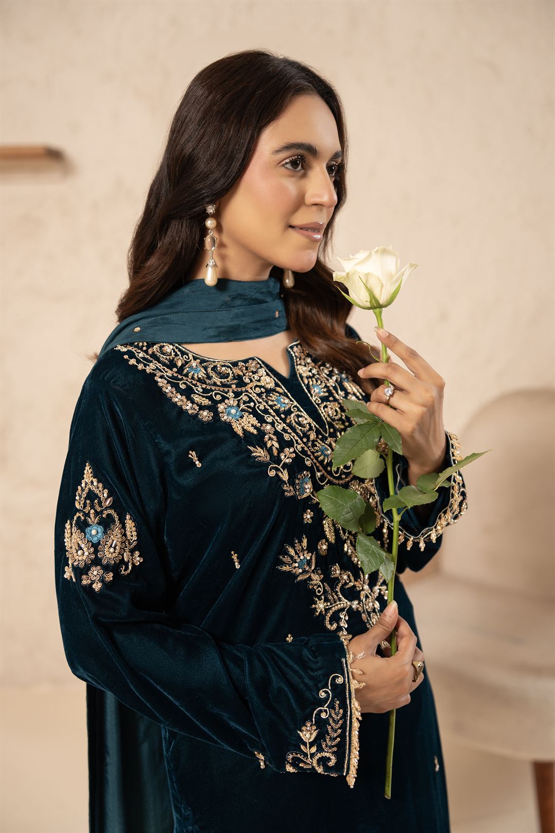 Exude timeless luxury with our Ayla — Midnight Velvet 3 Piece, designed for festive occasions and evening wear. Crafted with premium velvet, this outfit combines richness with intricate handwork for a regal look.