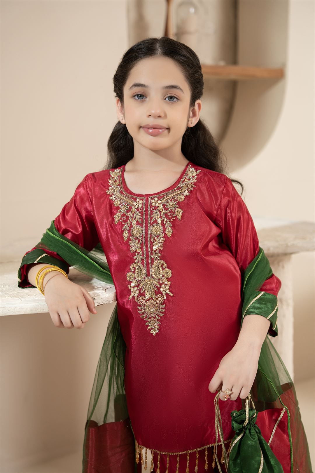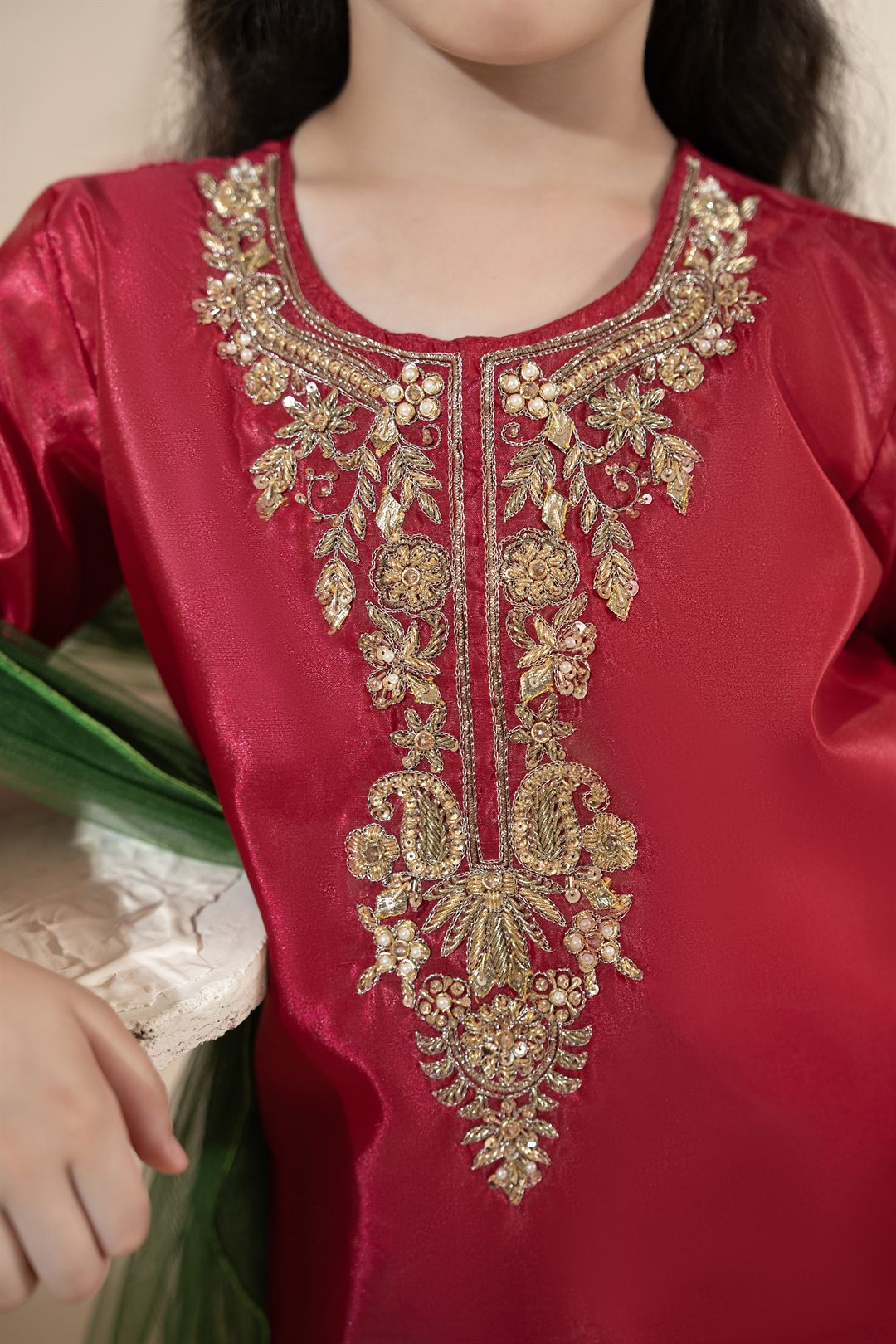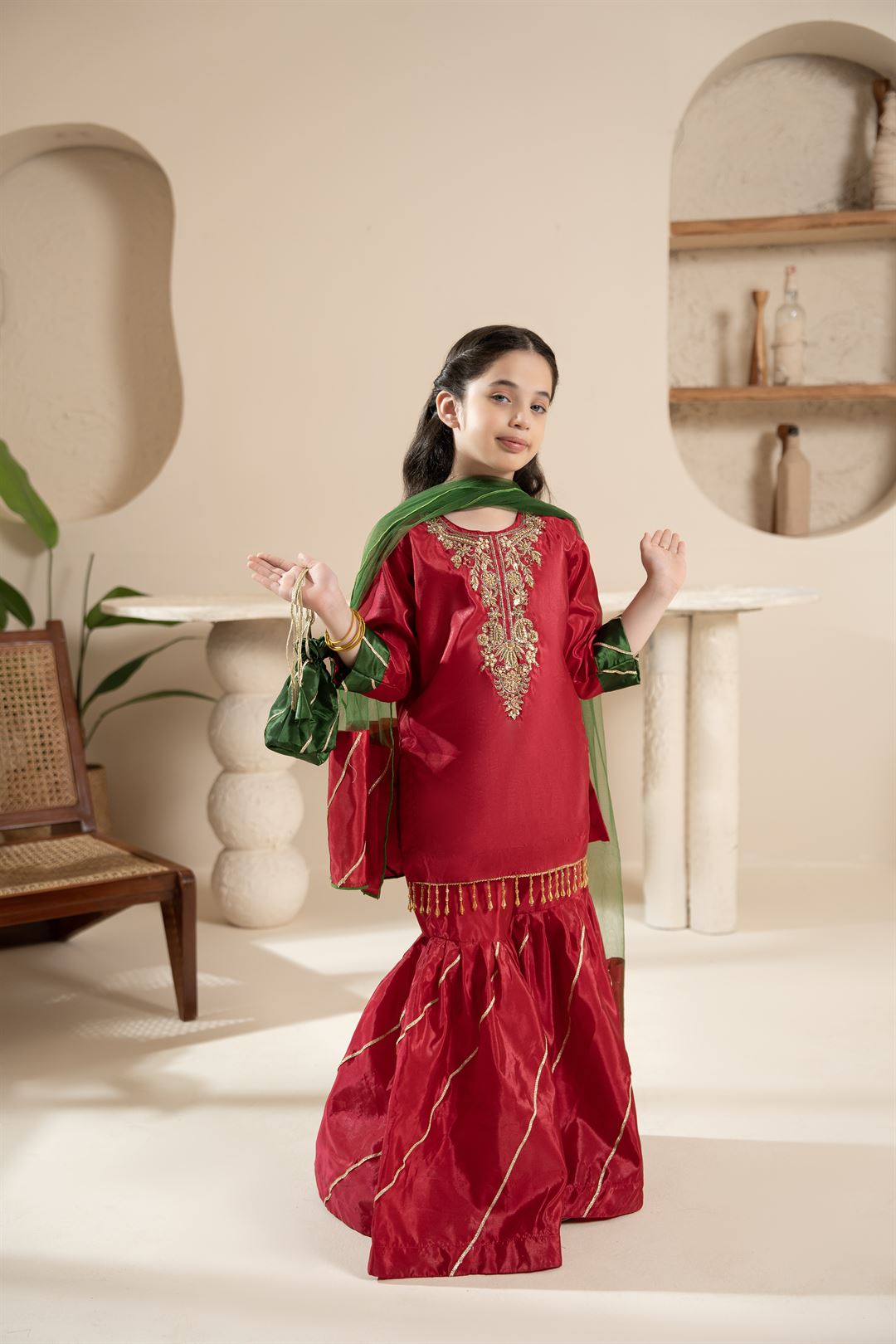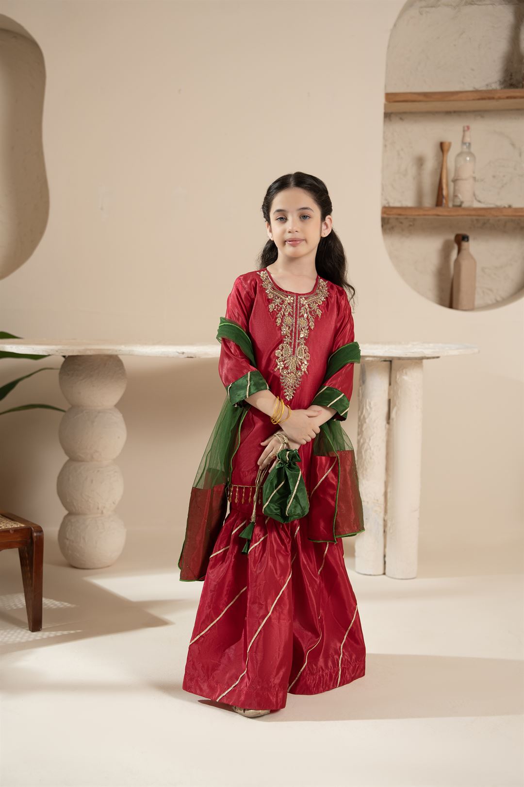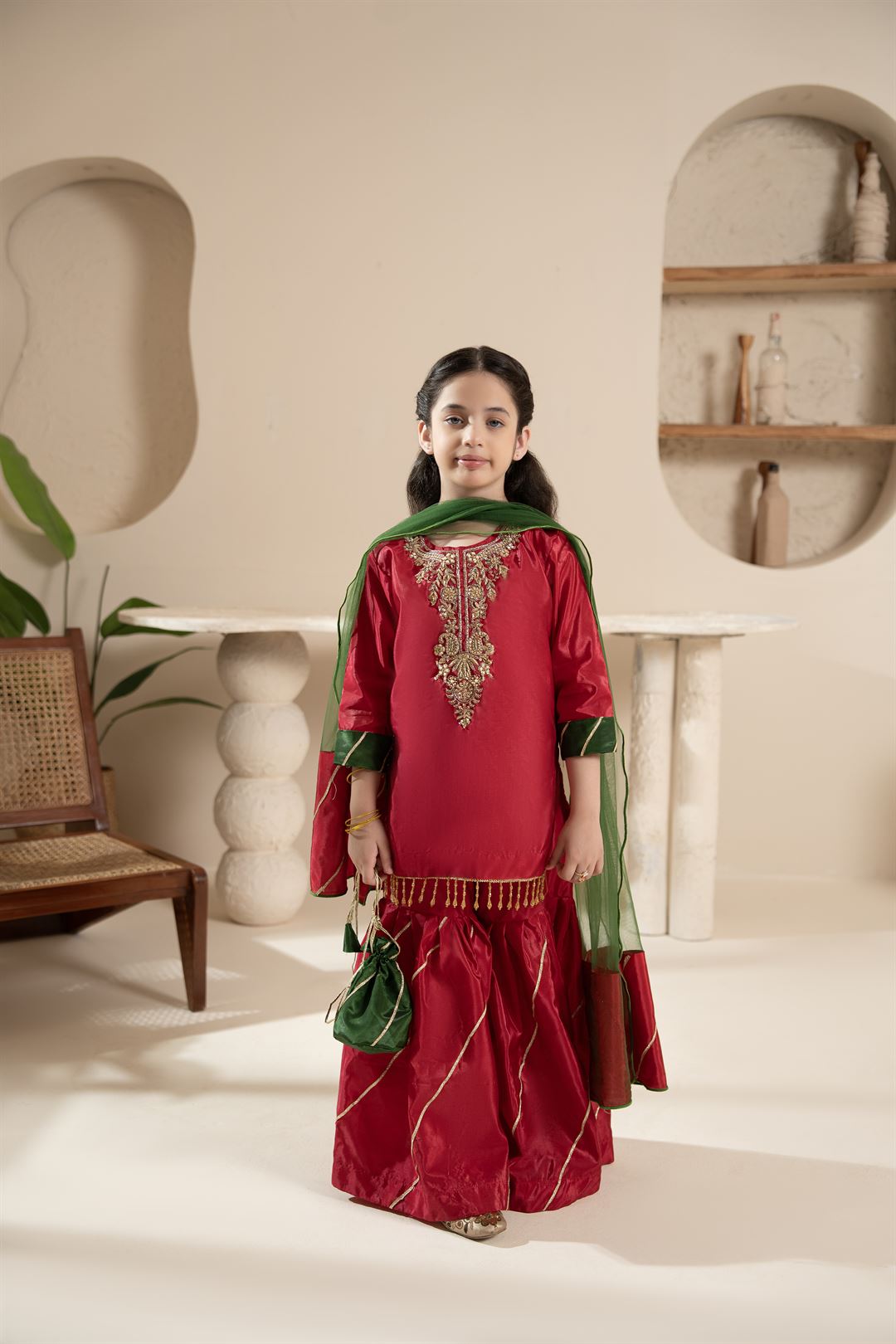 A vibrant hot pink silk garara set with zardozi worked on the neckline, paired with a soft net green dupatta and a cute matching pouch. A perfect pick for weddings, and festive occasions.