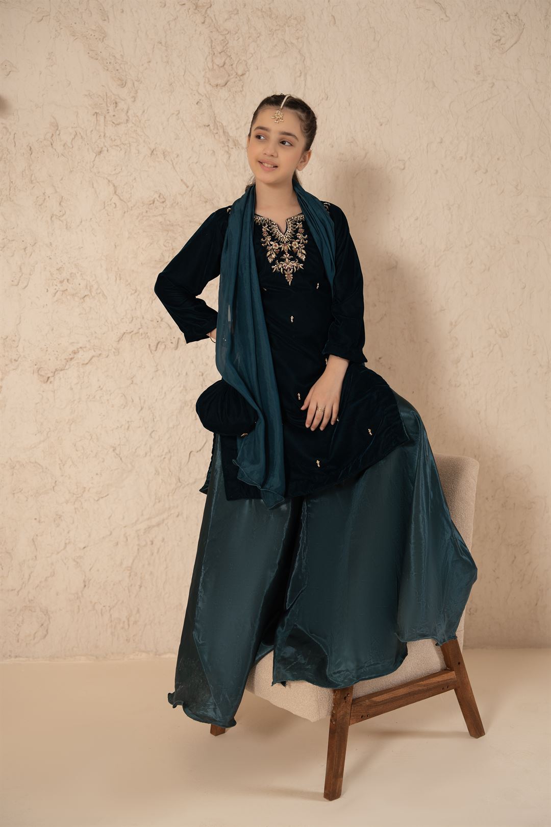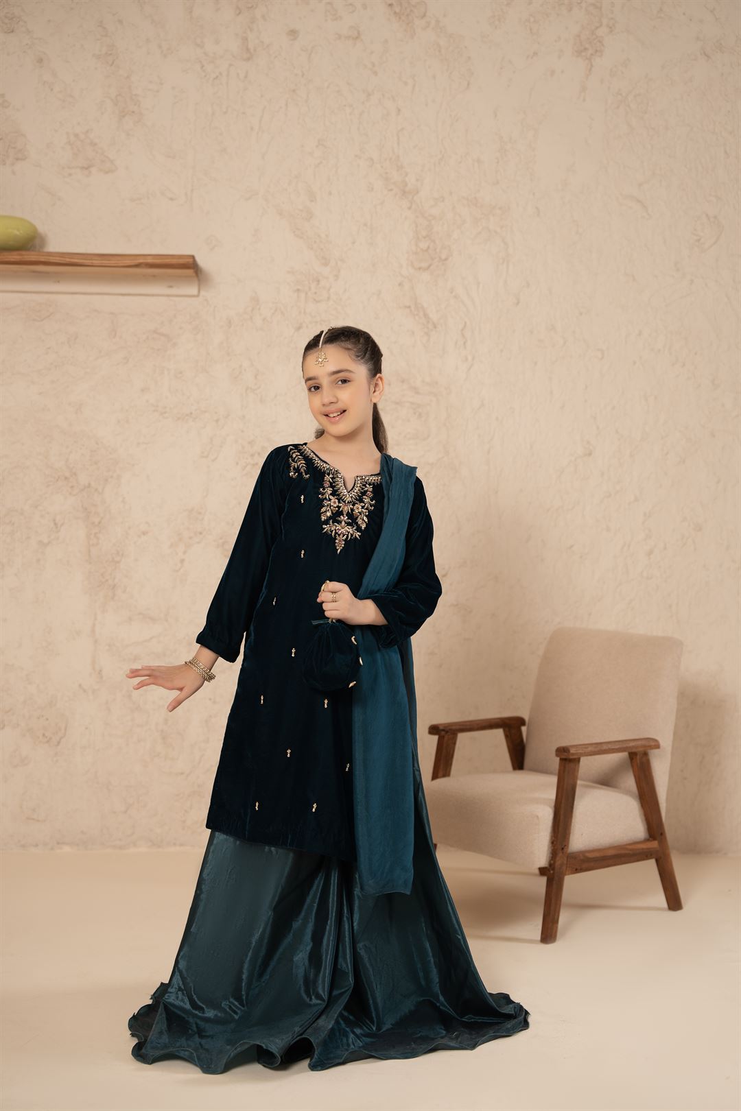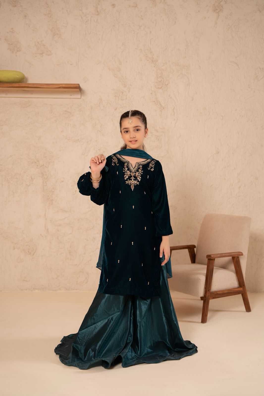 Nayab is a statement 4-piece ensemble, crafted with timeless elegance. The velvet shirt is intricately hand-embellished with kora, dabka, and resham work, paired with a graceful sharara, a soft dupatta, and a matching potli bag. A regal outfit made for weddings and grand festivities.