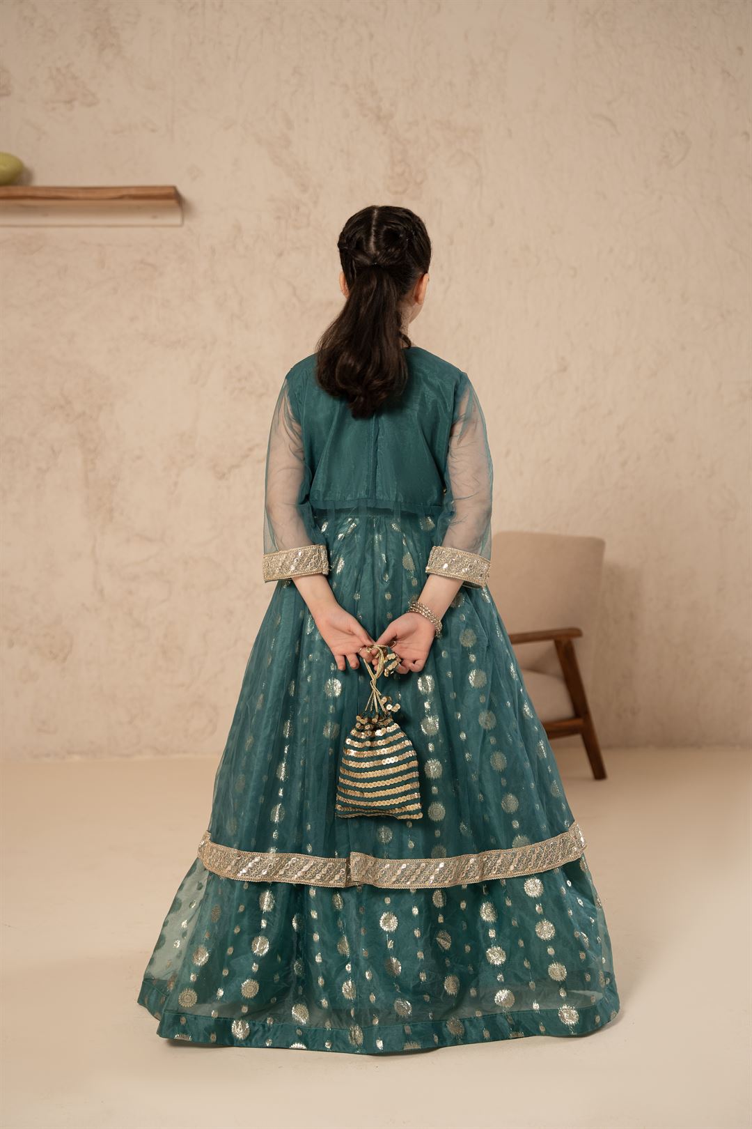 A regal 4-piece ensemble featuring a golden striped gown over a rich emerald lehnga, paired with a matching dupatta and Potli bag – the perfect festive statement for your little princess.
