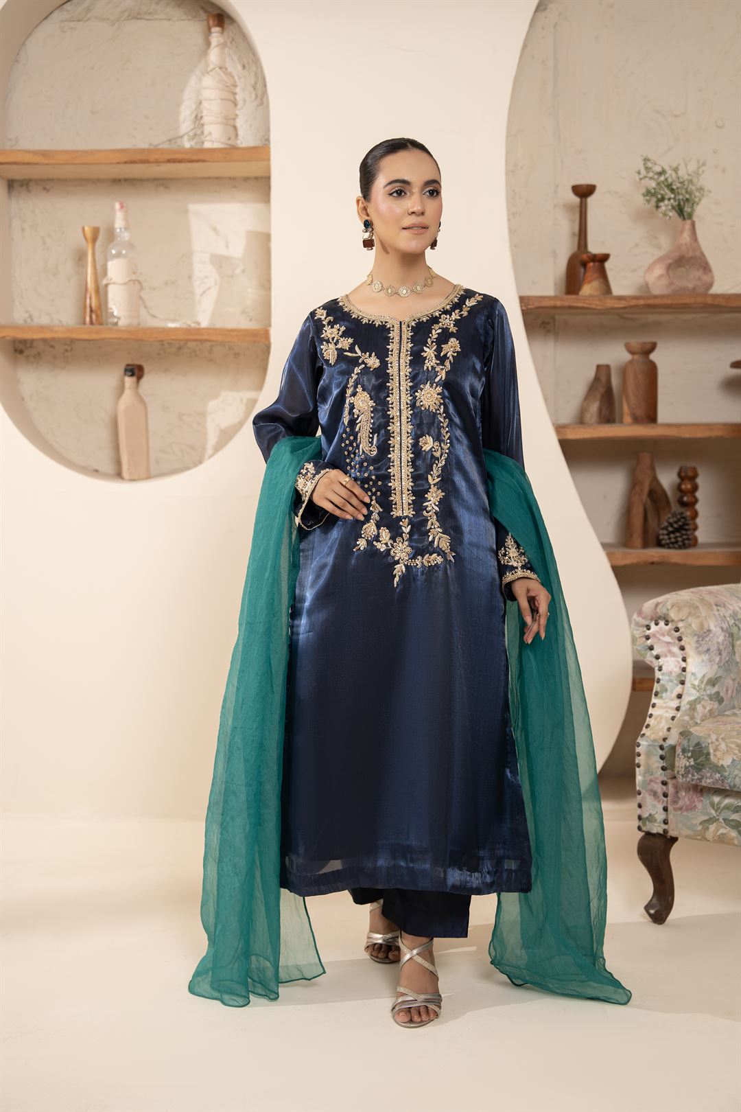 An elegant navy blue silk suit with hand worked with kora dabka on the neckline and sleeves, paired with straight silk trousers and a contrasting green organza dupatta. A timeless choice for weddings, festive events, and formal evenings.