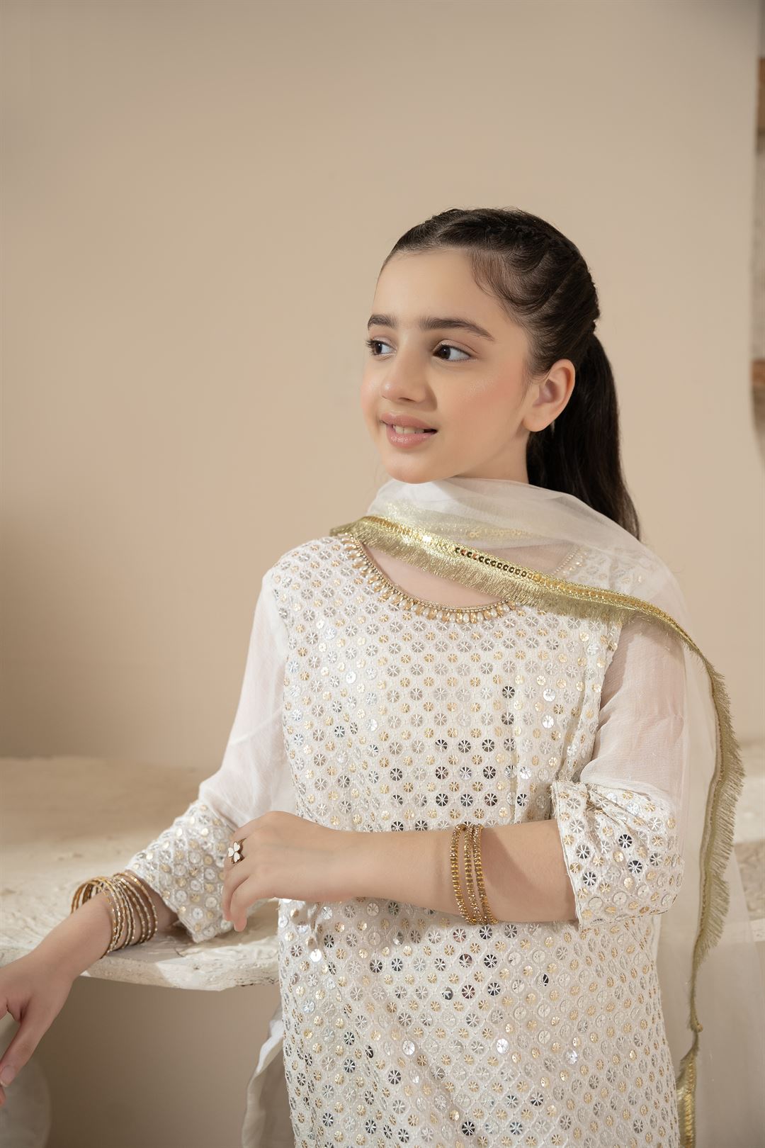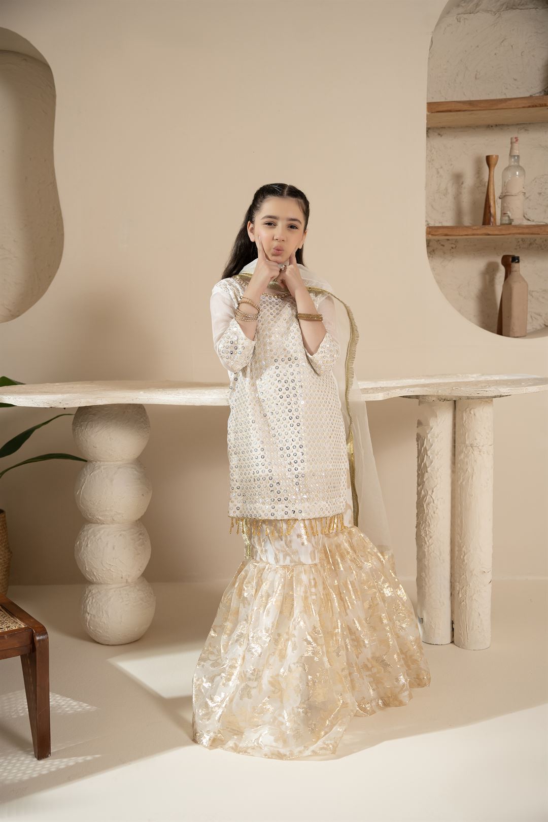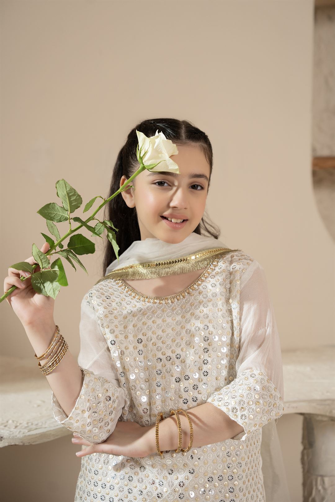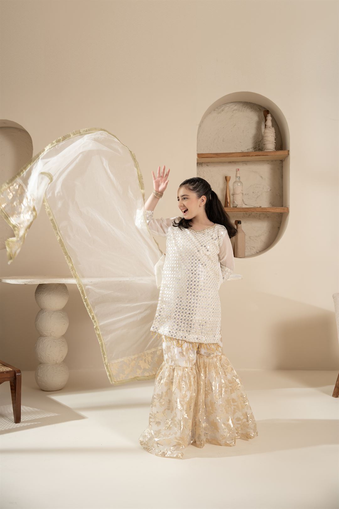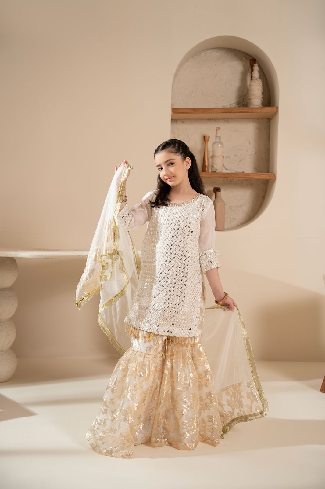 A stunning 4-piece chiffon ensemble featuring a sequin embroidered shirt, matching garara, soft dupatta, and potli bag. Perfect for weddings and festive occasions.