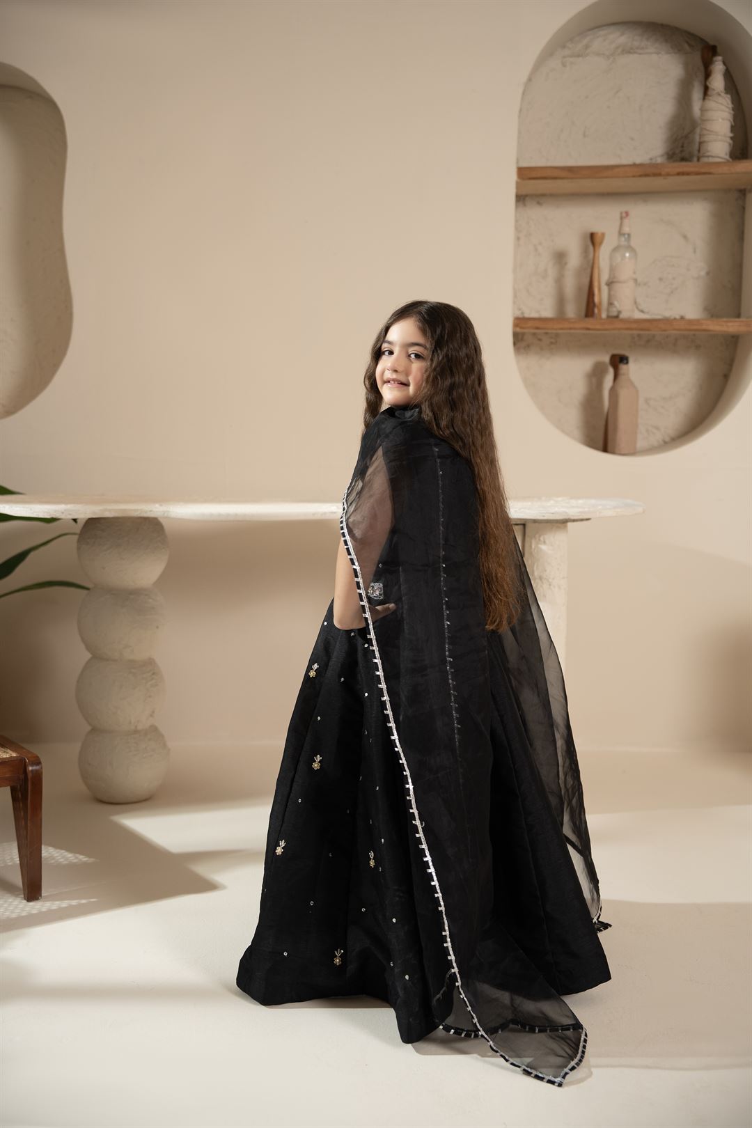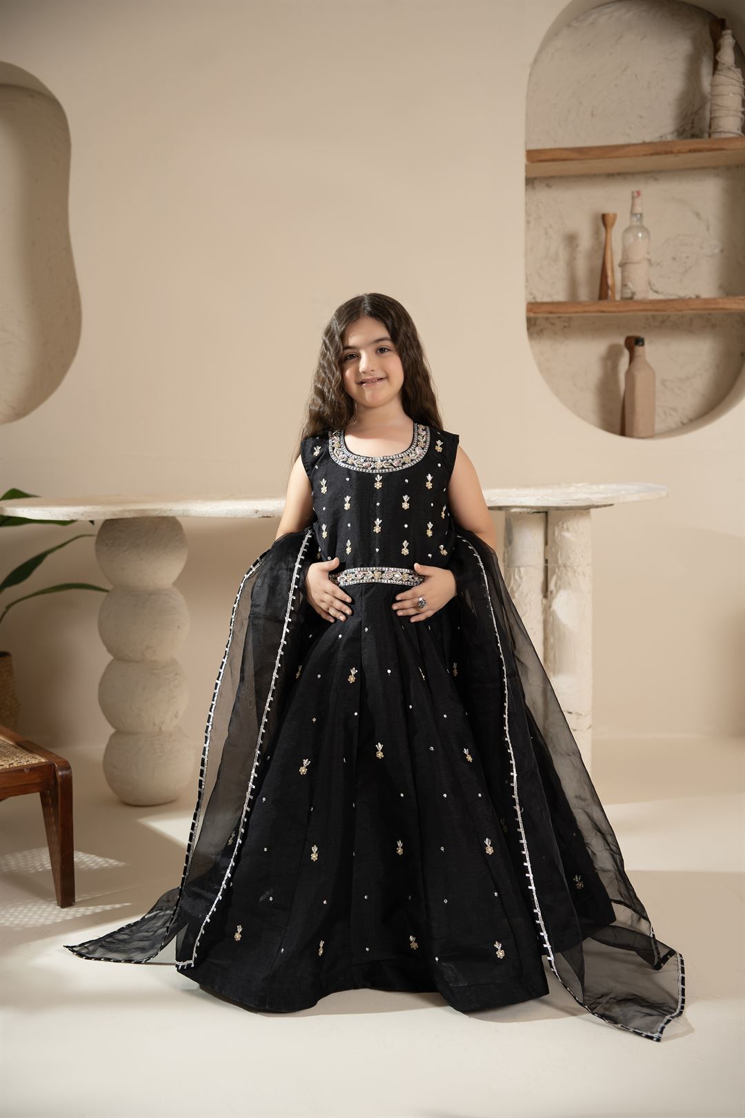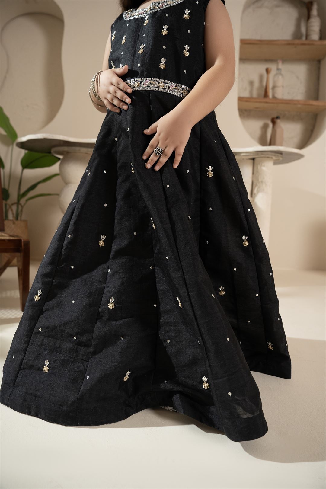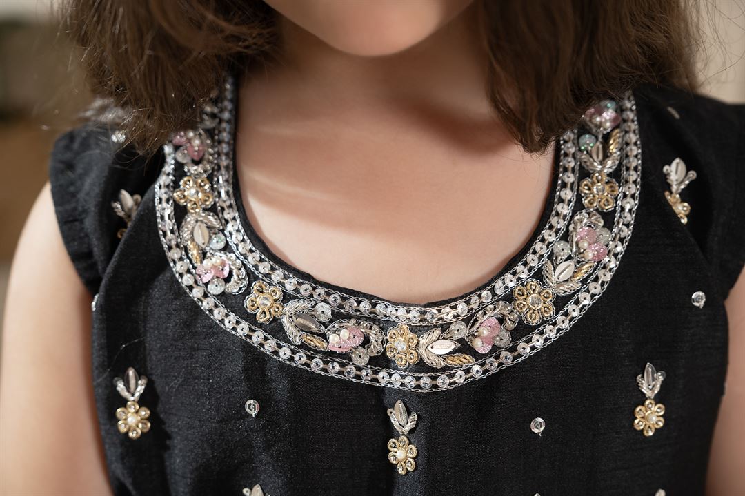 An elegant black raw silk maxi exquisitely adorned with hand-worked silver sequins, pearls, and kora dabka detailing. The rich craftsmanship on the luxurious fabric creates a timeless statement, making it a perfect choice for formal and wedding festivities.
