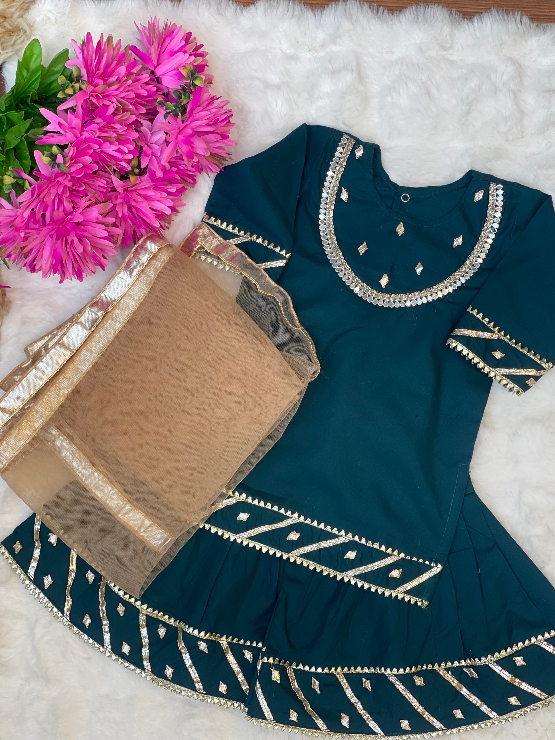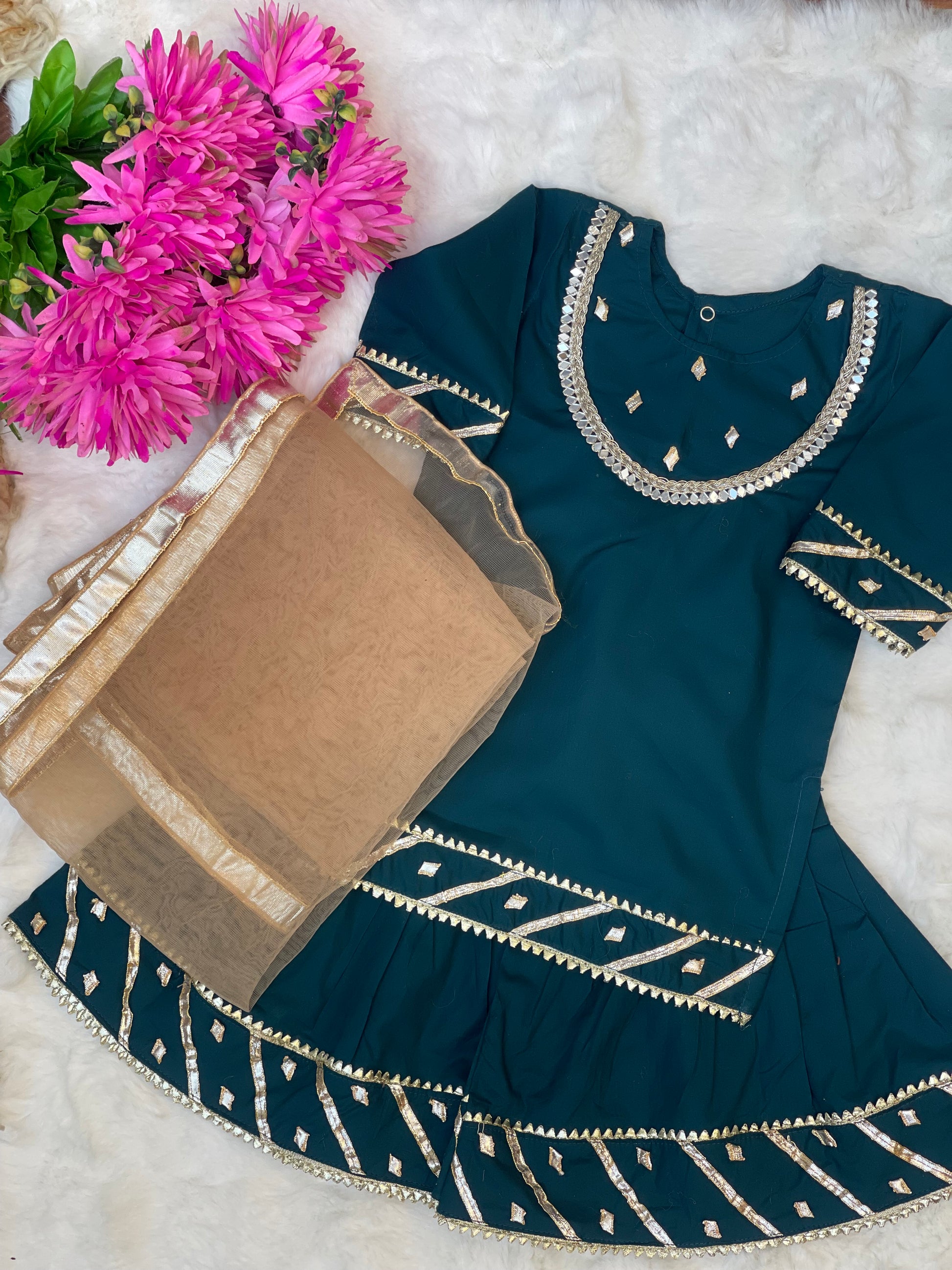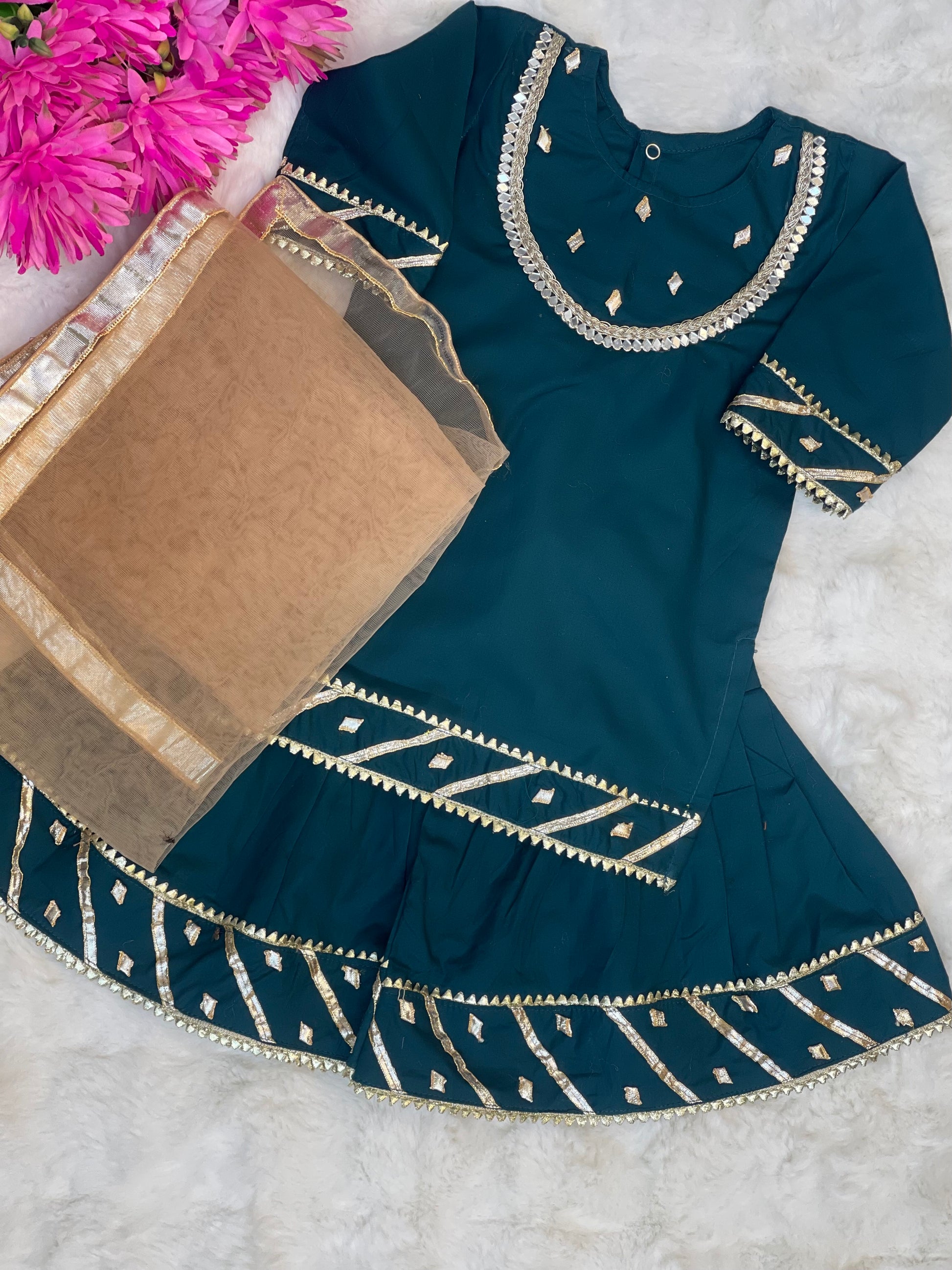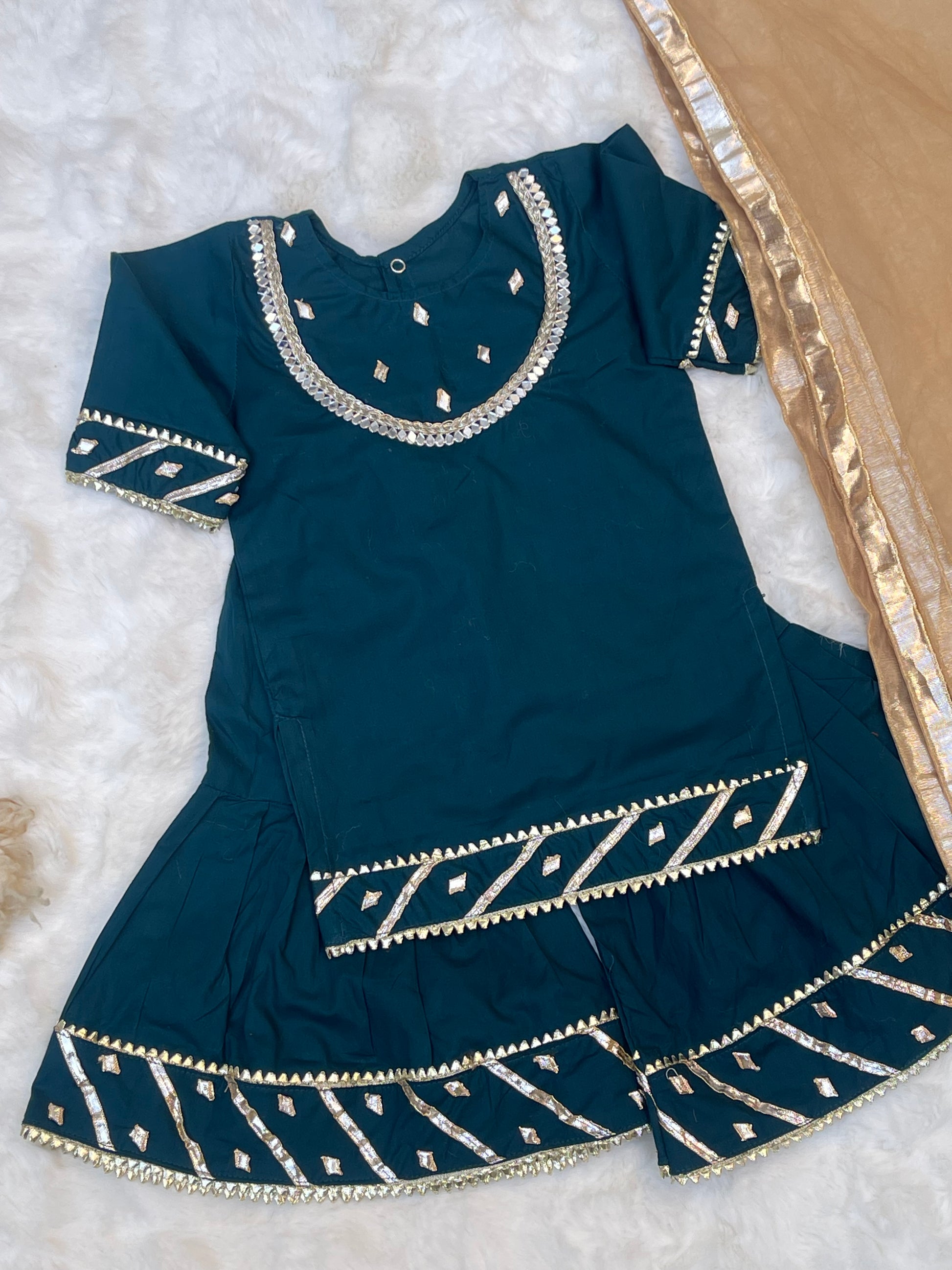This is a beautiful teal green traditional outfit for girls, featuring a full sleeves top with intricate golden embellishments around the neckline and hem. The set includes stylish flared gharara pants adorned with matching gold detailing, giving it an elegant and festive look. Perfect for special occasions and celebrations, this outfit blends classic charm with modern style.