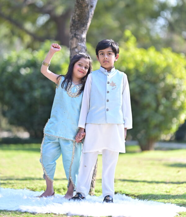 Crafted with premium quality fabric, each set includes two beautifully coordinated Salwar Kameez outfits, perfect for siblings who appreciate the richness of heritage and style. The luxurious fabric drapes gracefully, while the meticulous Gota detailing enhances the ensemble’s allure, making it perfect for both casual gatherings and festive occasions.