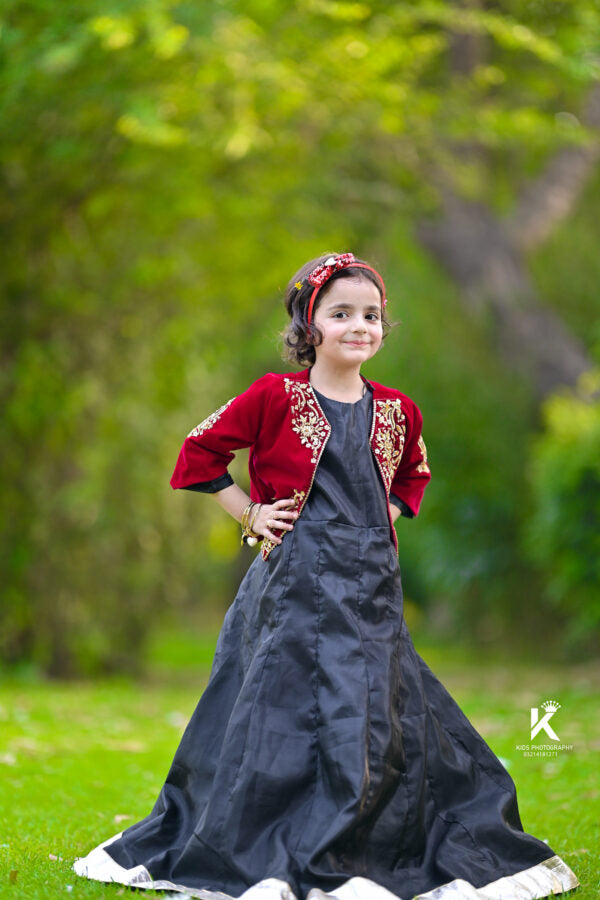 Description: Elevate your style to a whole new level with our Midnight Elegance Ensemble. This exquisite outfit combines the timeless charm of a Black Anarkali silk frock with the artistry of a handmade jacket, creating a stunning fusion of tradition and modernity.