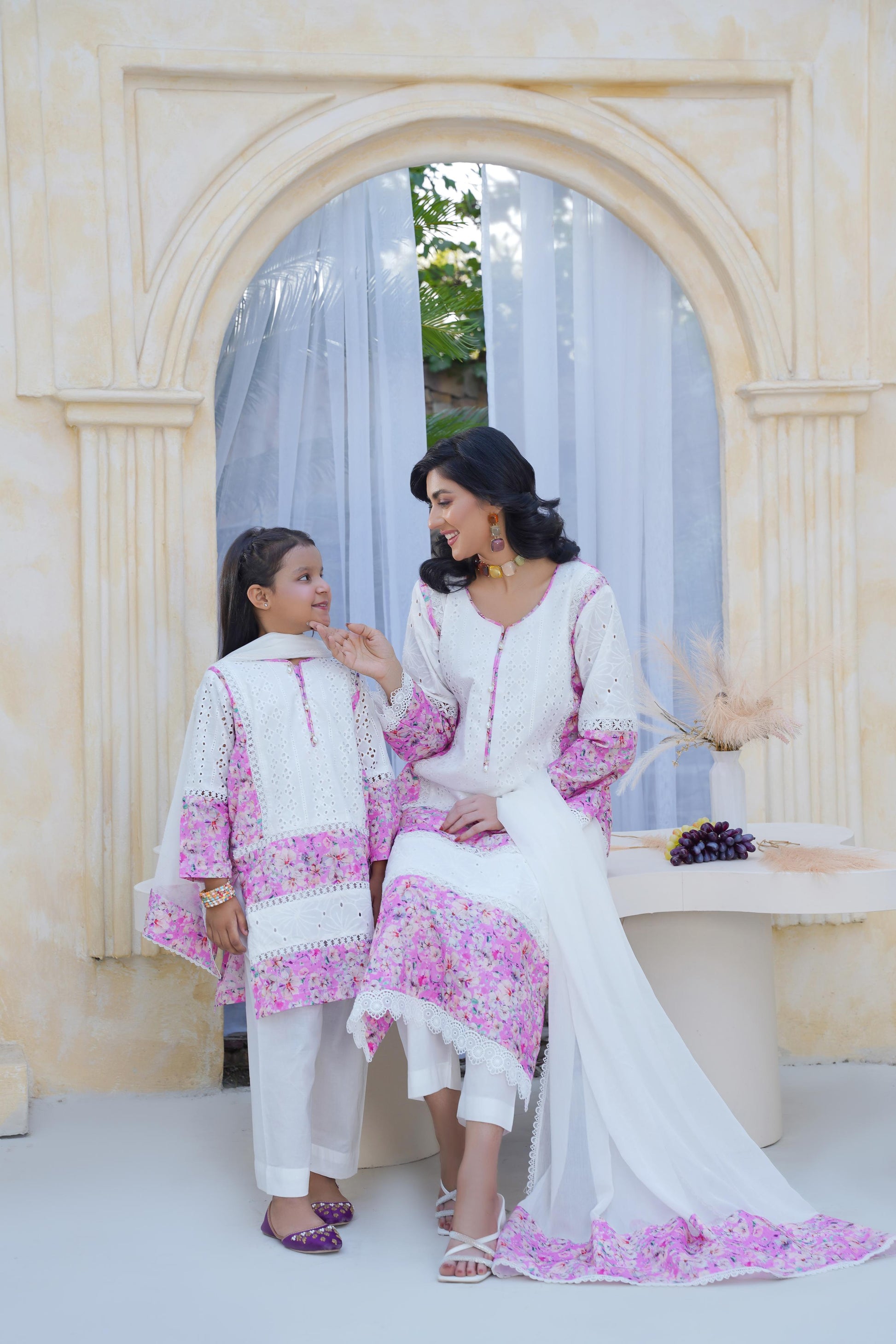 Let your little one shine in the mahru Kids Chikankri Suit, a beautifully crafted three-piece outfit featuring delicate print with white chikankari , paired with a comfortable trouser and a graceful dupatta